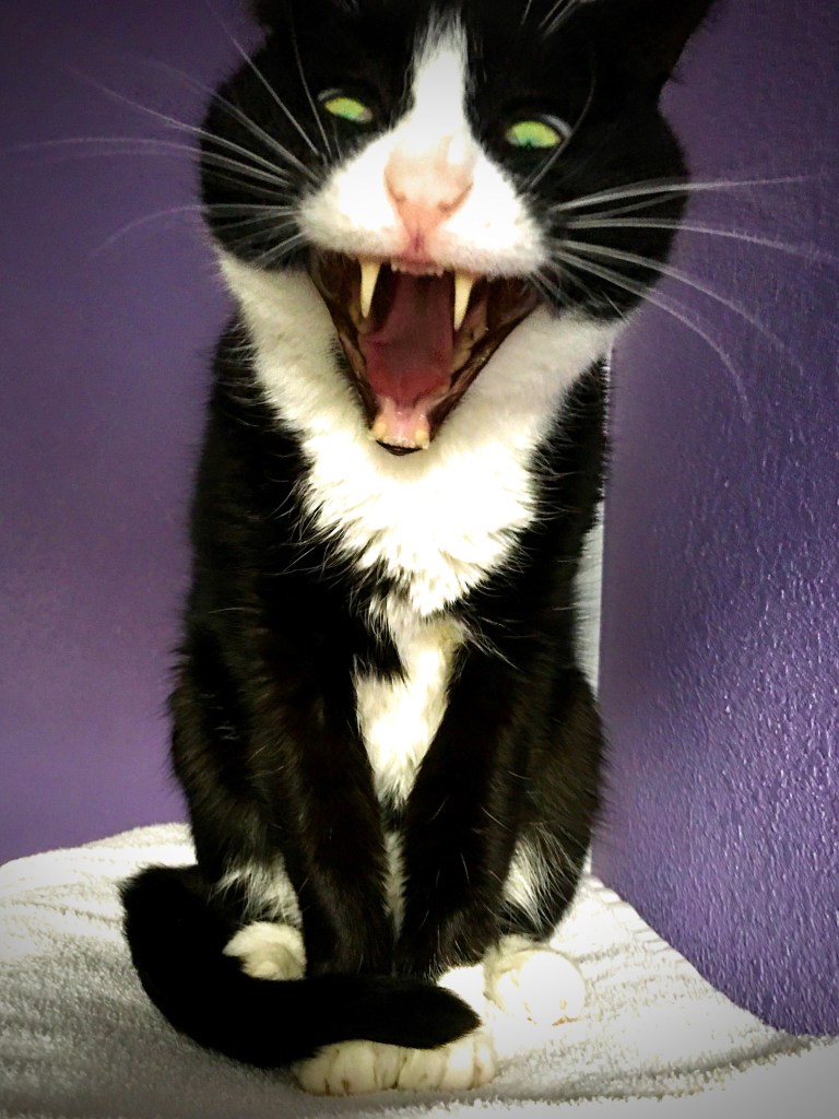 When he has finally had enough in and out, he picks his way onto my half-lotus lap, perching his dense, tuxedo-marked body precariously along my left thigh. I shift to keep him from sliding off and lose myself in early memories of him. The kitten of a neighborhood stray, he had already endured most of a brittle Minnesota winter before we discovered him. It was years before he learned basic house cat joys like climbing into a warm human lap and settling into undisturbed sleep. In fact, my partner and I had to love him assertively in those earliest months, feeding him by hand, and scooping him up and scratching his neck until his body surrendered into gentle human hands. The first time he climbed into my lap on his own, it was so normal that it took me a moment to recognize it as unprecedented. But there it was: after years of calm sing-song assurances and patient waiting, this skittish animal stepped into my lap and settled, warm as a baked potato.
