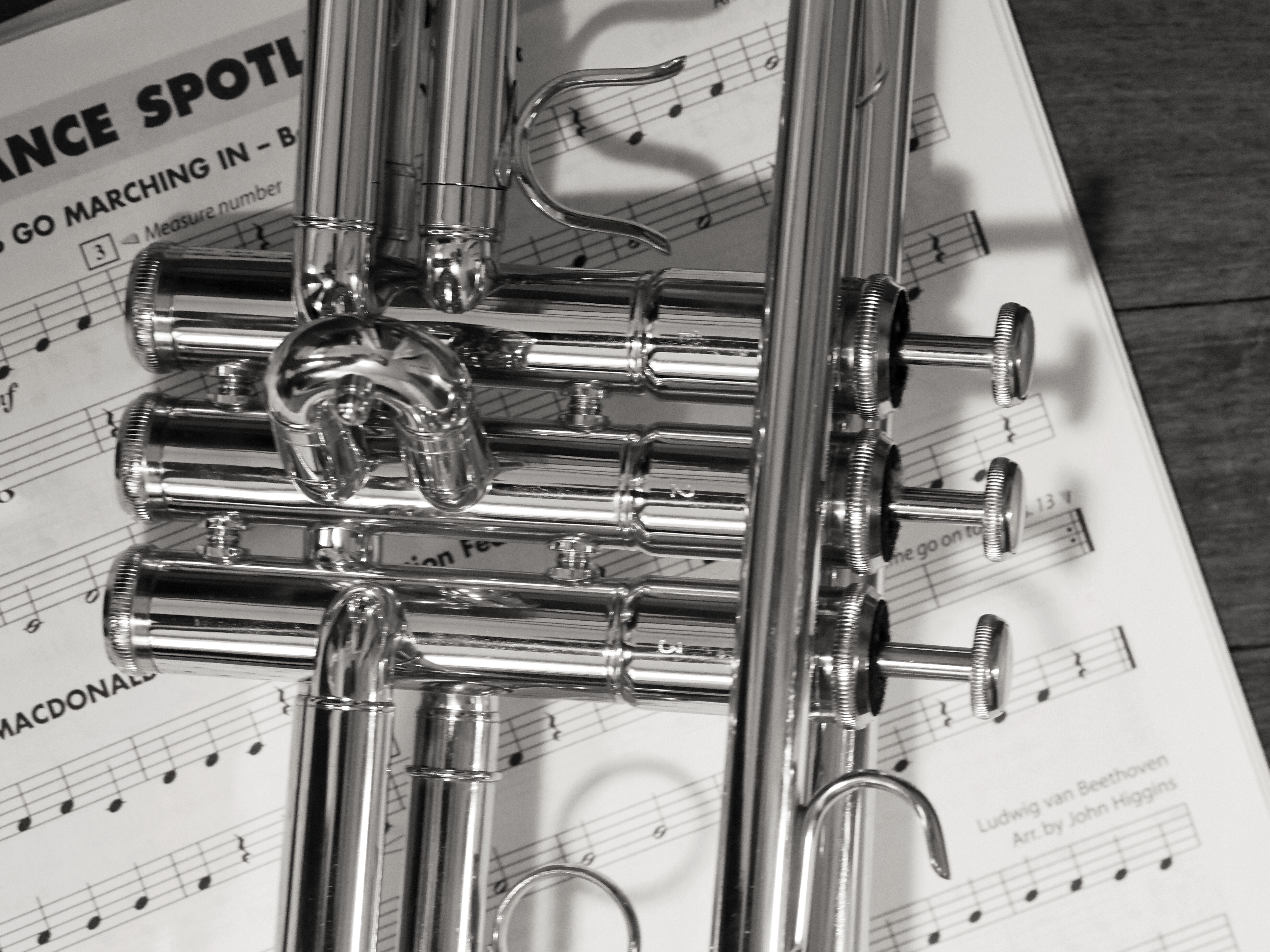 My first bout with this cheap, new-used trumpet a few months ago was a little rough. I sputtered and panted, and my tone was so poor I wondered if the instrument was stuffed with spiders’ eggs. Even so, I was surprised to find that my lips and fingers slipped automatically into the chromatic scale. I moved up and down the rickety steps. With difficulty, sure, as if I’d just had a knee replacement, but I moved. And my improvement has been rapid. In fact, I think I’m already better than I was as a diffident junior high school band kid.