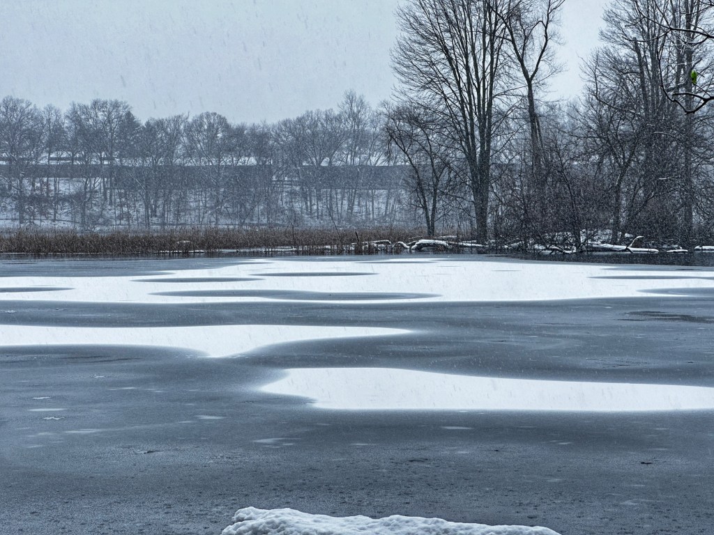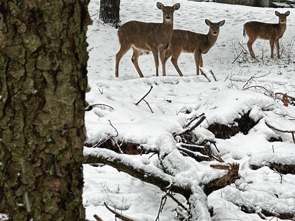 But today is today and here I am, right? It is subjectively, phenomenologically unmistakable that this is me, isn’t it? My gloved left hand gripping a tree for support as I seek purchase between icy roots and unreliable piles of frozen, muddy leaves. And because I am focused on the ruts and the branches and my feet, I do not see the trio of deer—a doe and two smaller ones—until I am almost upon them. Her limpid, affronted eyes appraise me and for a split second, I am back in junior high, walking past pretty girls preening at their lockers. I inhabit my pre-teen self: palpable shyness, the wrong brand of sneakers, a jaw I had yet to grow into. Meanwhile, the doe, with her penetrating stare and graceful curves, sees me for what I am: awkward interloper with no idea what to do or say. I try to give a wide birth—avoid, avoid, avoid—but it is not enough. The doe huffs impatiently and the three of them explode away, leaping so high and fast they seem to create a vortex, the air and falling snow trailing them like a comet’s tail. They are not fleeing me—I am not important enough—but are being molded and moved by the impending snowstorm through these nervous woods. Under pewter skies, as chunky snowflakes soften and blur all line and shape, the deer must move ever onward. In their creaturely way, they paw at the ground of the now, browsing through the tender shoots of immediacy, and surge up and away again and again and again.